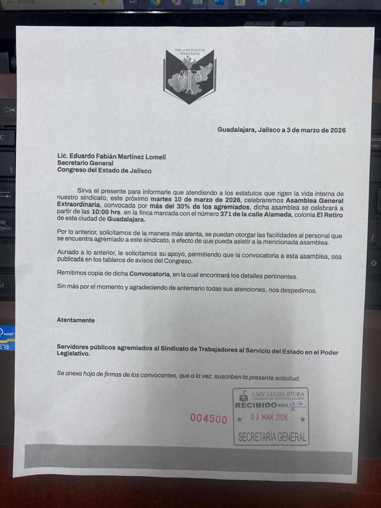 Es en este contexto que más de treinta por ciento de los agremiados al Sindicato de Trabajadores al Servicio del Estado en el Poder Legislativo ha convocado, conforme al Artículo Décimo Quinto de sus propios estatutos, a una Asamblea General Extraordinaria para el próximo 10 de marzo de 2026, a las diez horas, en el número 371 de la calle Alameda, colonia El Retiro, en Guadalajara. La convocatoria, fechada el tres de marzo y recibida ya tanto por la Secretaría General del Congreso como por la Federación de Sindicatos Autónomos Federados, señala sin ambages la razón: el secretario general del sindicato se negó a convocar la asamblea que se le había solicitado por escrito, pese a haberlo prometido públicamente para finales de febrero.